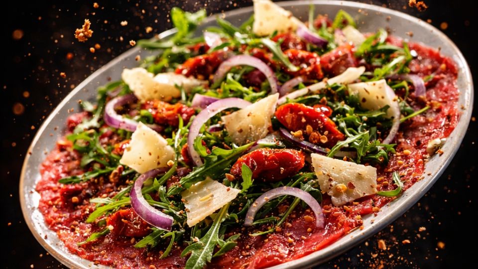 | Carpaccio de bœuf (salade au parmesan, tomates confites et oignons rouges) | 12,90 € |