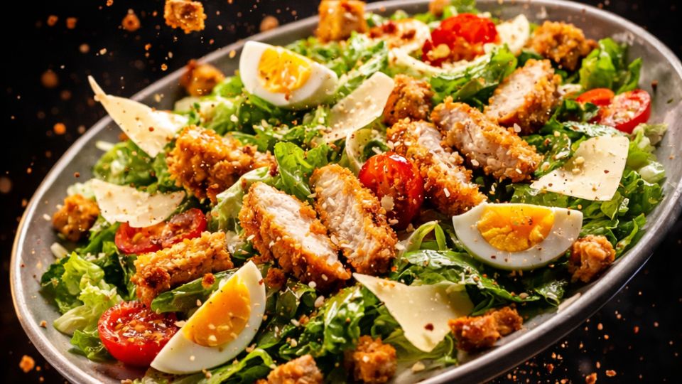 | Salade façon César (salade verte, tomates, œufs durs, copeaux de parmesan, poulet pané) | 9 € / 17.50 € (entrée / plat) |